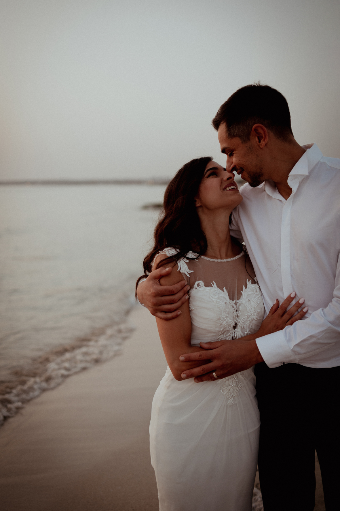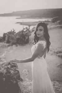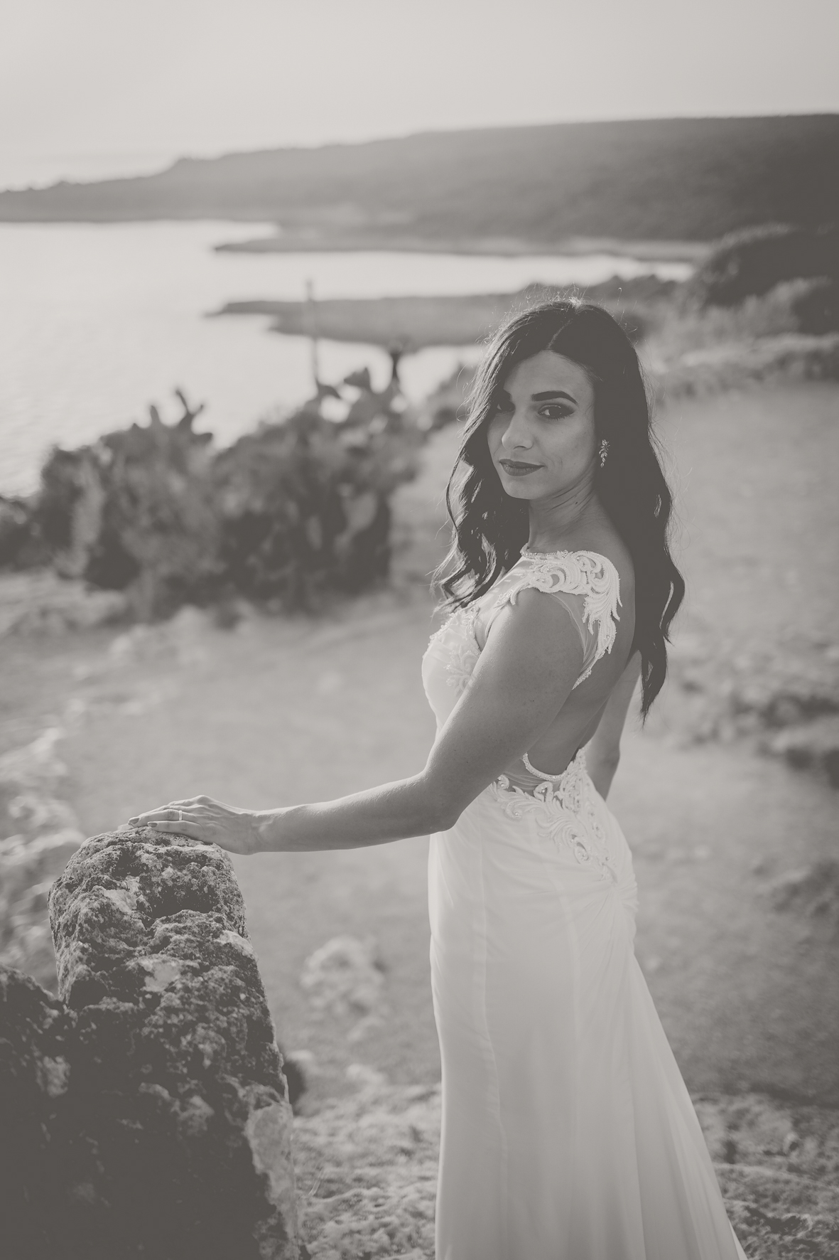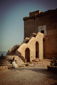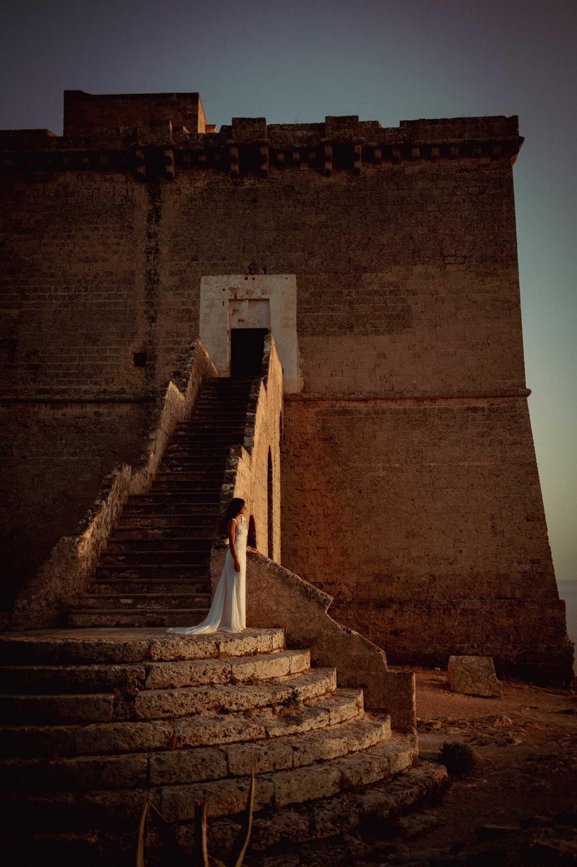 Quando abbiamo deciso la Puglia come meta delle nostre vacanze mi è venuto naturale pensare a come sarebbe stato fotografare, in un paesaggio completamente nuovo e diverso, una coppia di sposi. Ho cominciato a pensare a come fare, a come trovare una coppia lì a più di 1000 km di distanza. Grazie al mio lavoro ho instaurato tante conoscenze, tra clienti che ho fotografato e clienti del negozio, ho scritto a Francesca, leccese, che ora abita con la sua bellissima famiglia a 15 minuti da me. Lei oltre ad attivarsi per trovare una coppia mi ha dato tante dritte utili al nostro viaggio in Salento. Mi tremavano le mani dall’emozione quando ho visto gli sposi che mi aspettavano nella location scelta (Torre dell’Alto a Porto Cesareo) immediatamente il clima è diventato leggero e amichevole. Emanuela e Manuel si sono prestati con trasporto ed emozione davanti al mio obiettivo.