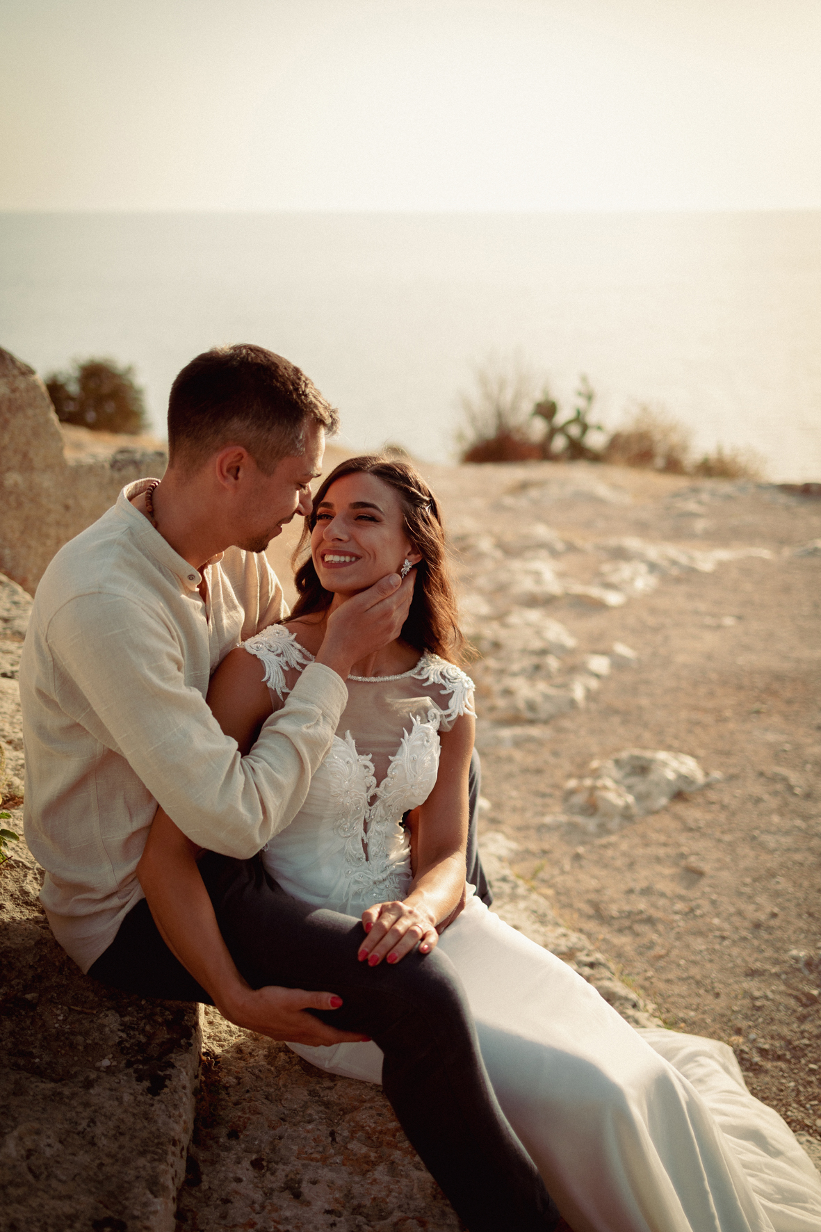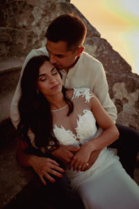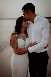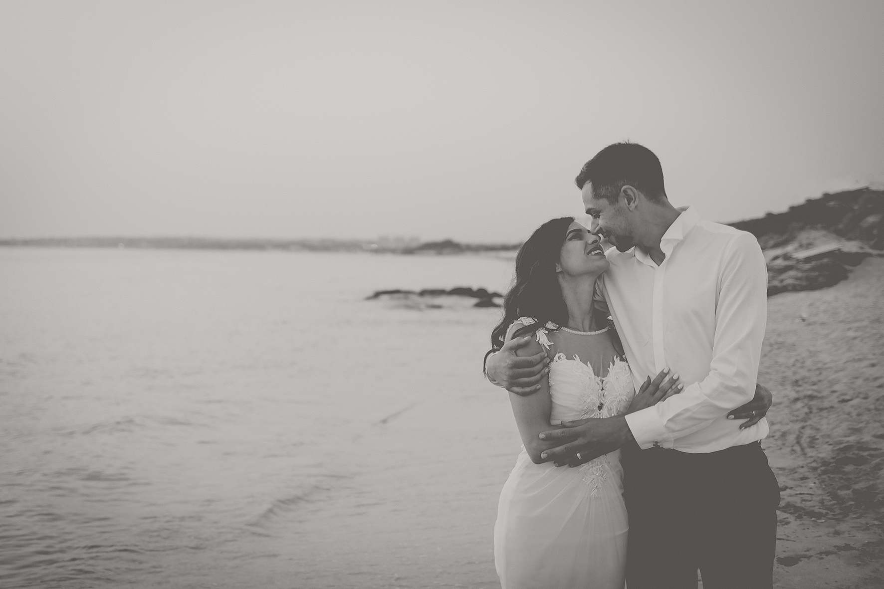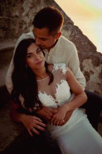 Quando abbiamo deciso la Puglia come meta delle nostre vacanze mi è venuto naturale pensare a come sarebbe stato fotografare, in un paesaggio completamente nuovo e diverso, una coppia di sposi. Ho cominciato a pensare a come fare, a come trovare una coppia lì a più di 1000 km di distanza. Grazie al mio lavoro ho instaurato tante conoscenze, tra clienti che ho fotografato e clienti del negozio, ho scritto a Francesca, leccese, che ora abita con la sua bellissima famiglia a 15 minuti da me. Lei oltre ad attivarsi per trovare una coppia mi ha dato tante dritte utili al nostro viaggio in Salento. Mi tremavano le mani dall’emozione quando ho visto gli sposi che mi aspettavano nella location scelta (Torre dell’Alto a Porto Cesareo) immediatamente il clima è diventato leggero e amichevole. Emanuela e Manuel si sono prestati con trasporto ed emozione davanti al mio obiettivo.