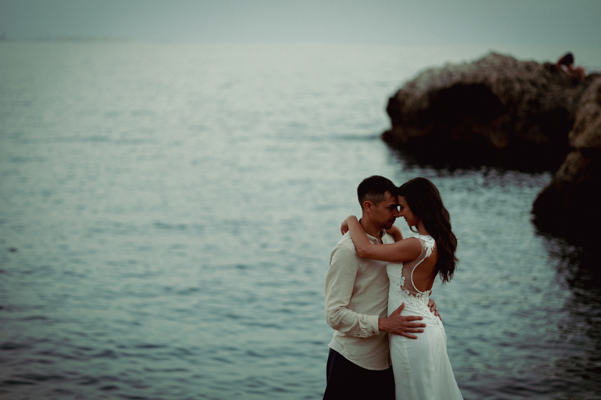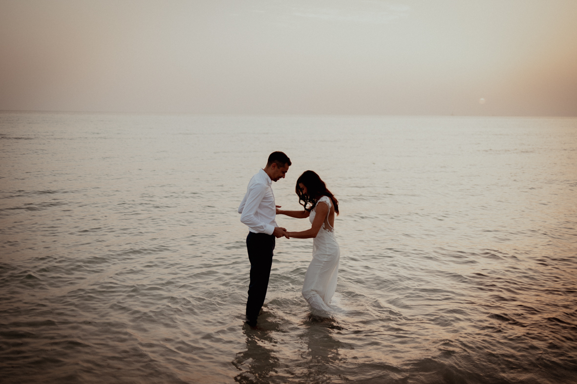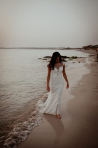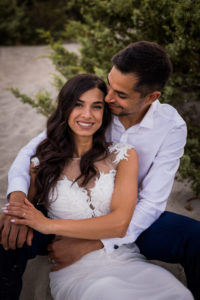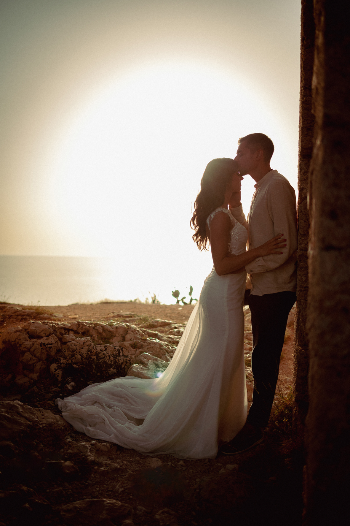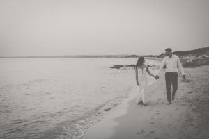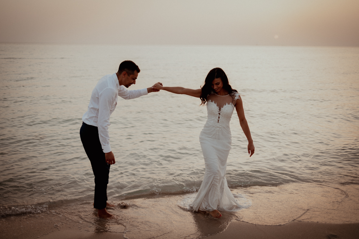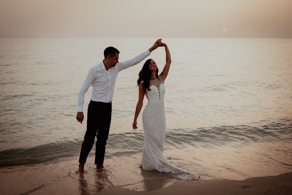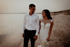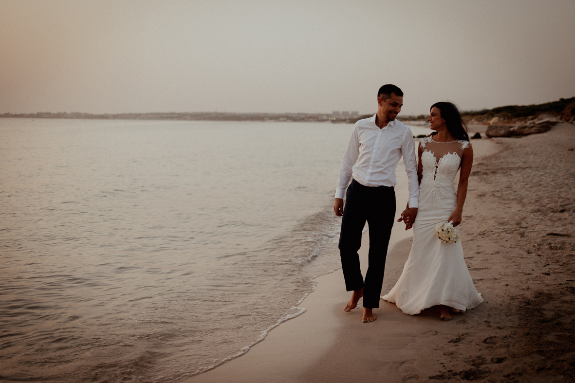 Ci siamo trovati un’altra sera, al tramonto, per scattare in spiaggia, abbiamo scelto una delle spiaggia della baia di Gallipoli. Sabbia chiara e mare trasparente. Gli sposi hanno improvvisato un ballo immersi fino ai piedi nell’acqua e per finire qualche scatto in pineta.
