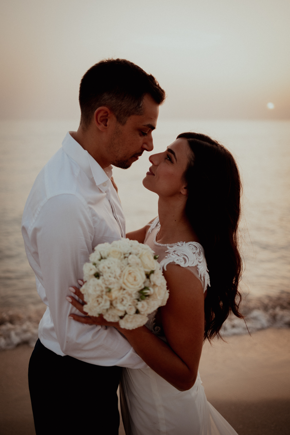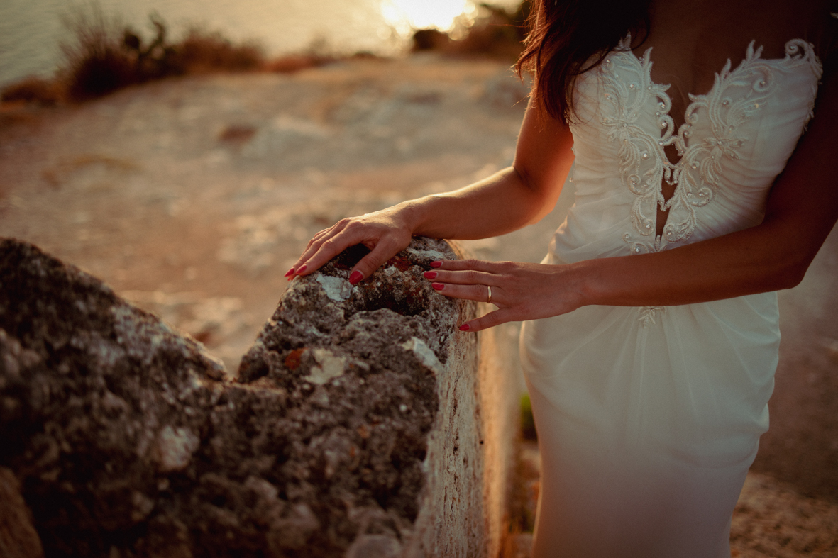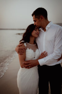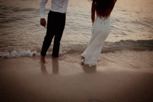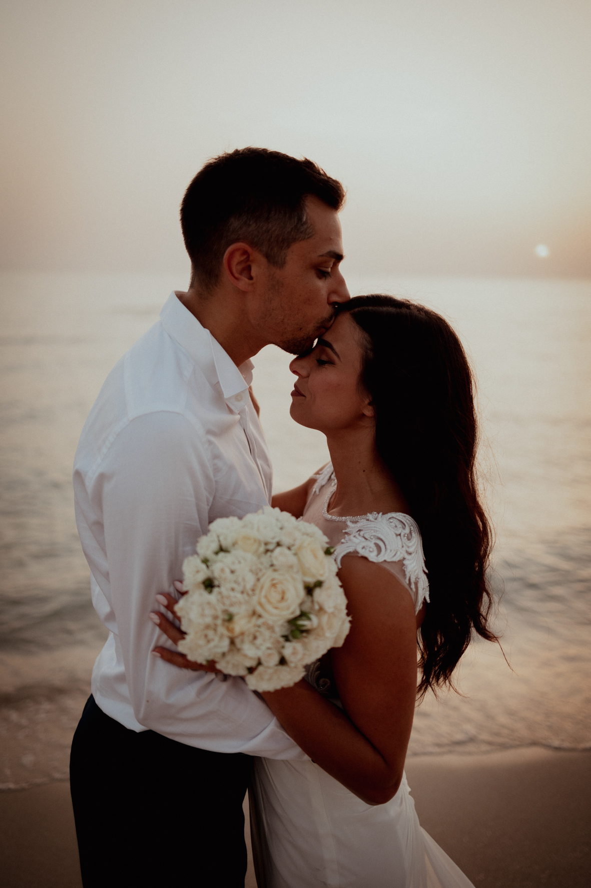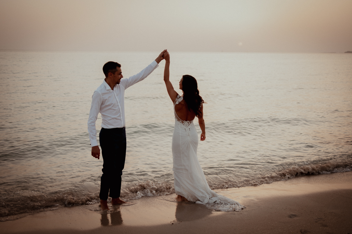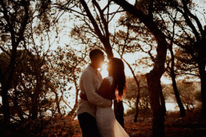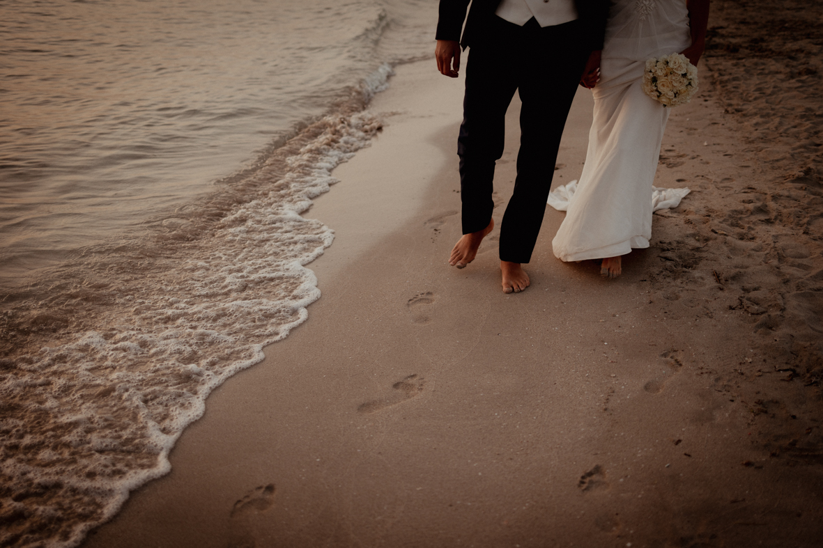 Ci siamo trovati un’altra sera, al tramonto, per scattare in spiaggia, abbiamo scelto una delle spiaggia della baia di Gallipoli. Sabbia chiara e mare trasparente. Gli sposi hanno improvvisato un ballo immersi fino ai piedi nell’acqua e per finire qualche scatto in pineta.