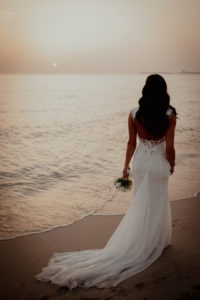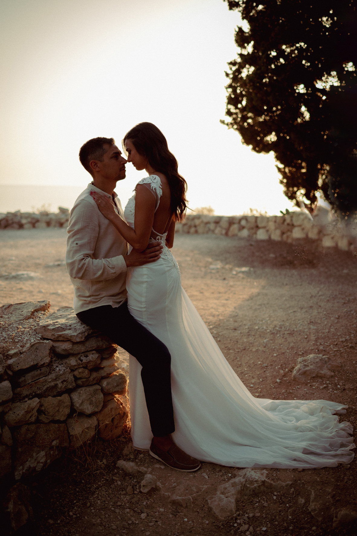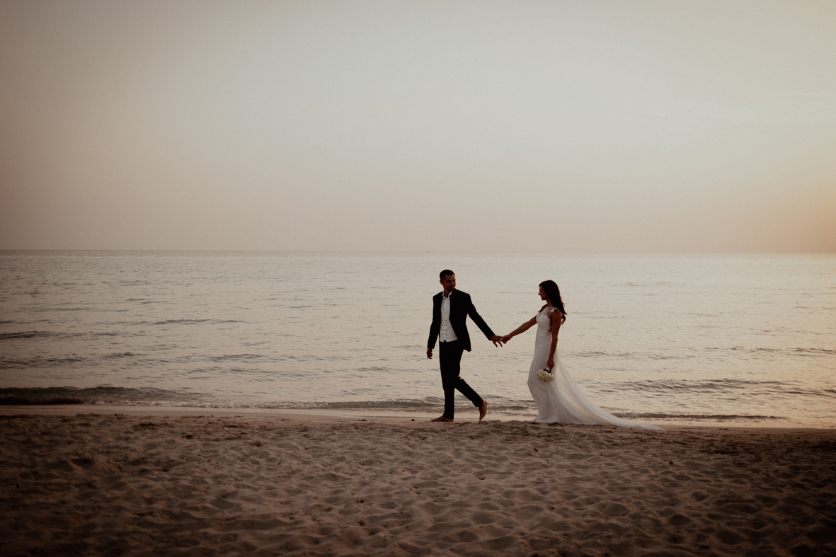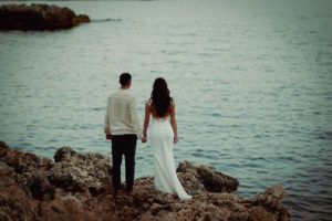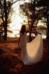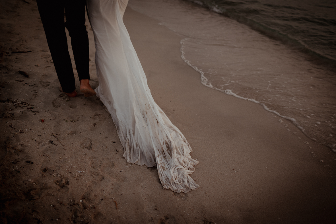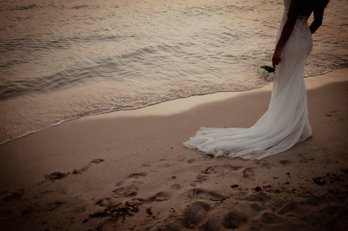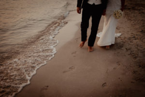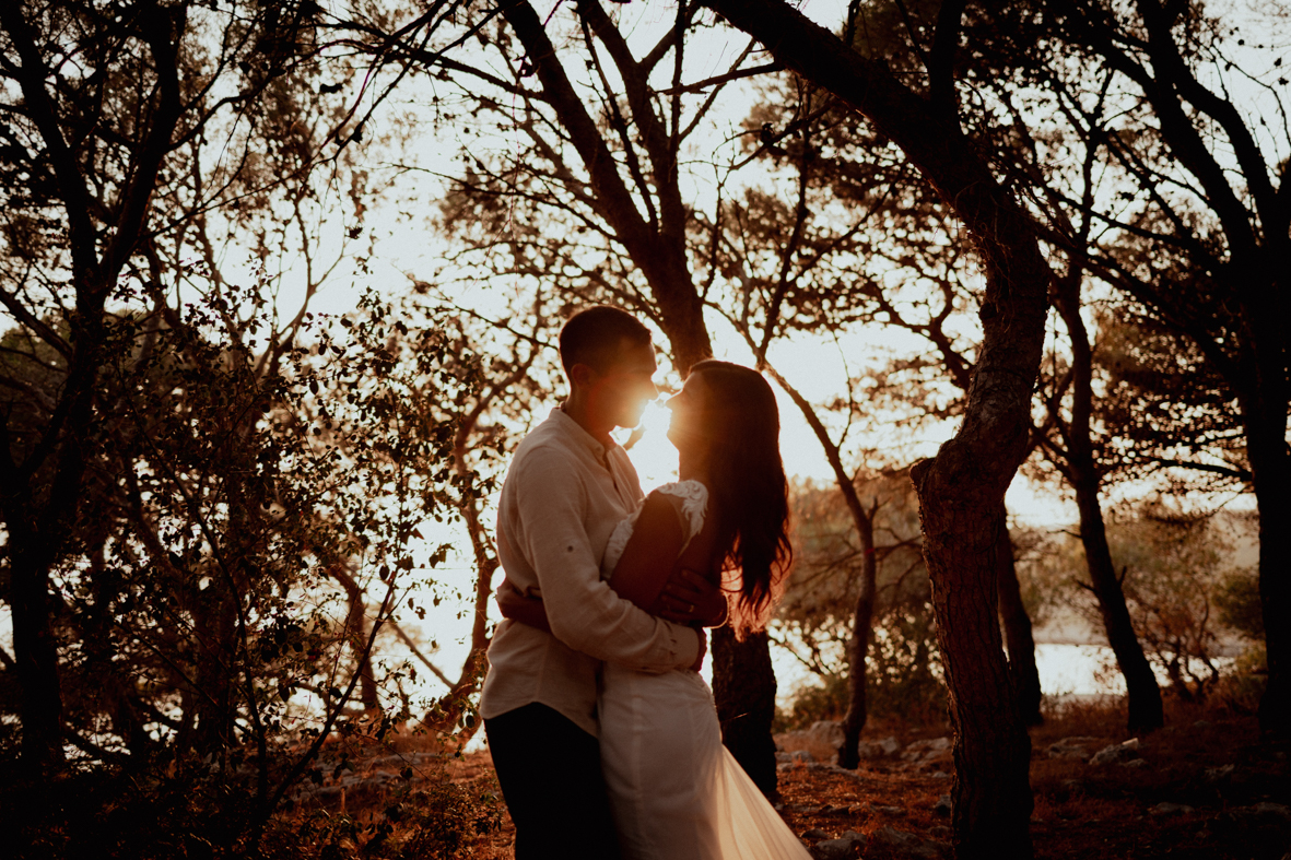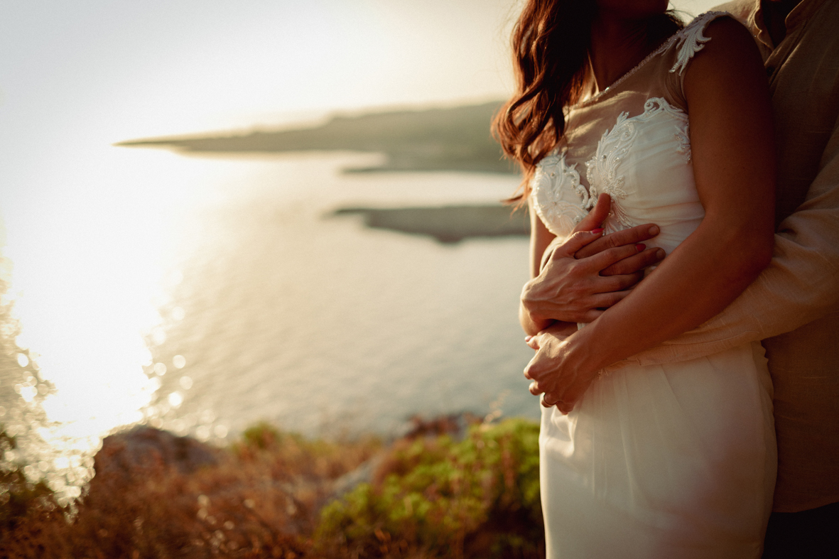 Ci siamo trovati un’altra sera, al tramonto, per scattare in spiaggia, abbiamo scelto una delle spiaggia della baia di Gallipoli. Sabbia chiara e mare trasparente. Gli sposi hanno improvvisato un ballo immersi fino ai piedi nell’acqua e per finire qualche scatto in pineta.